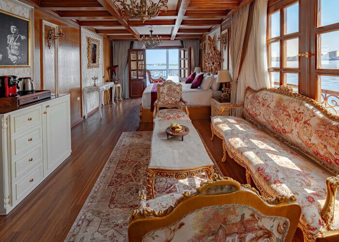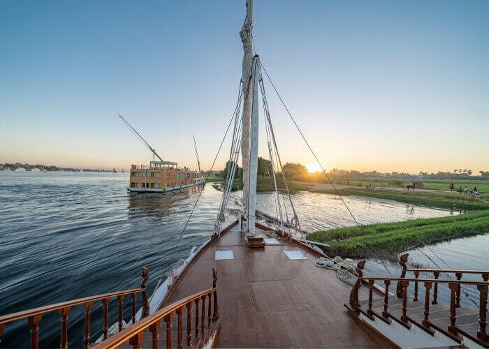 Step off your flight or say goodbye to your hotel, where our professional and gracious team awaits to whisk you away on a voyage fit for royalty. Upon your arrival at the Dahabiya Nile Cruise, you’ll be welcomed by the sight of this elegant vessel—a floating palace adorned with luxurious furnishings and exquisite décor. Settle into your PRIVATE SUITE and take some time to rest and relax. Soon, you’ll be invited to savor your first delicious lunch on board, all while admiring the majestic beauty of the Nile River gliding past.